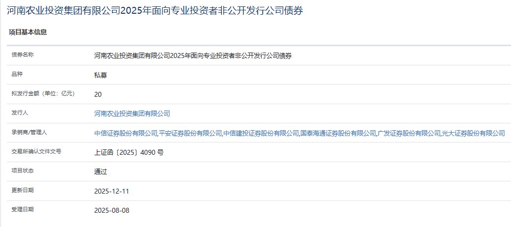 【大河财立方消息】12月11日,上交所债券项目信息平台显示,河南农业投资集团有限公司2025年面向专业投资者非公开发行公司债券项目获通过。债券拟发行金额20亿元,承销商/管理人为中信证券、平安证券、中信建投(601066)、国泰海通、广发证券、光大证券。